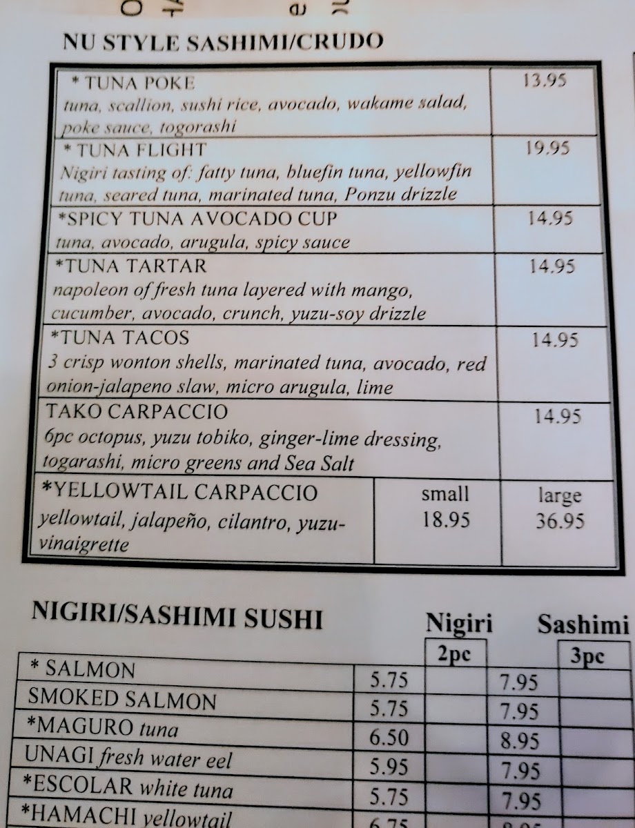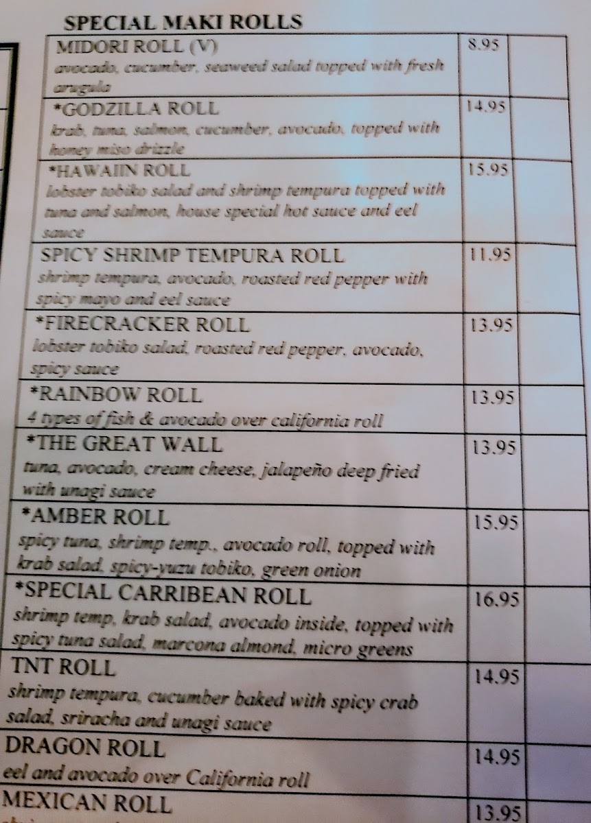 Sushi and Rolls are available all day featuring a variety of classic and specialty rolls like Red Dragon Roll, Hawaiian Roll, Godzilla Roll, Sunfire Roll, and Salmon On The Beach. The menu offers raw and cooked sushi options, including Spicy Tuna Roll and Tuna Tartar, catering to traditional sushi preferences.