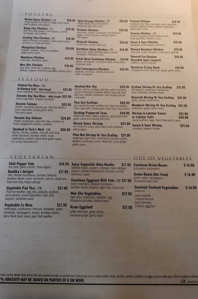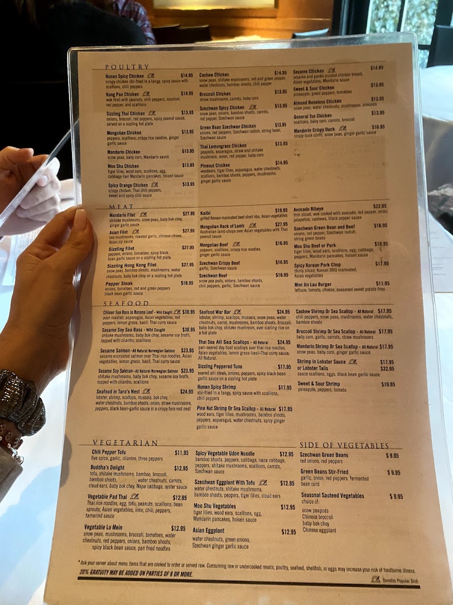 The menu at Mon Jin Lau offers a diverse selection of Asian fusion dishes with influences from Chinese, Japanese, Thai, and sushi cuisines. It is organized into distinct groups to accommodate various dining preferences, from appetizers to main courses and desserts.